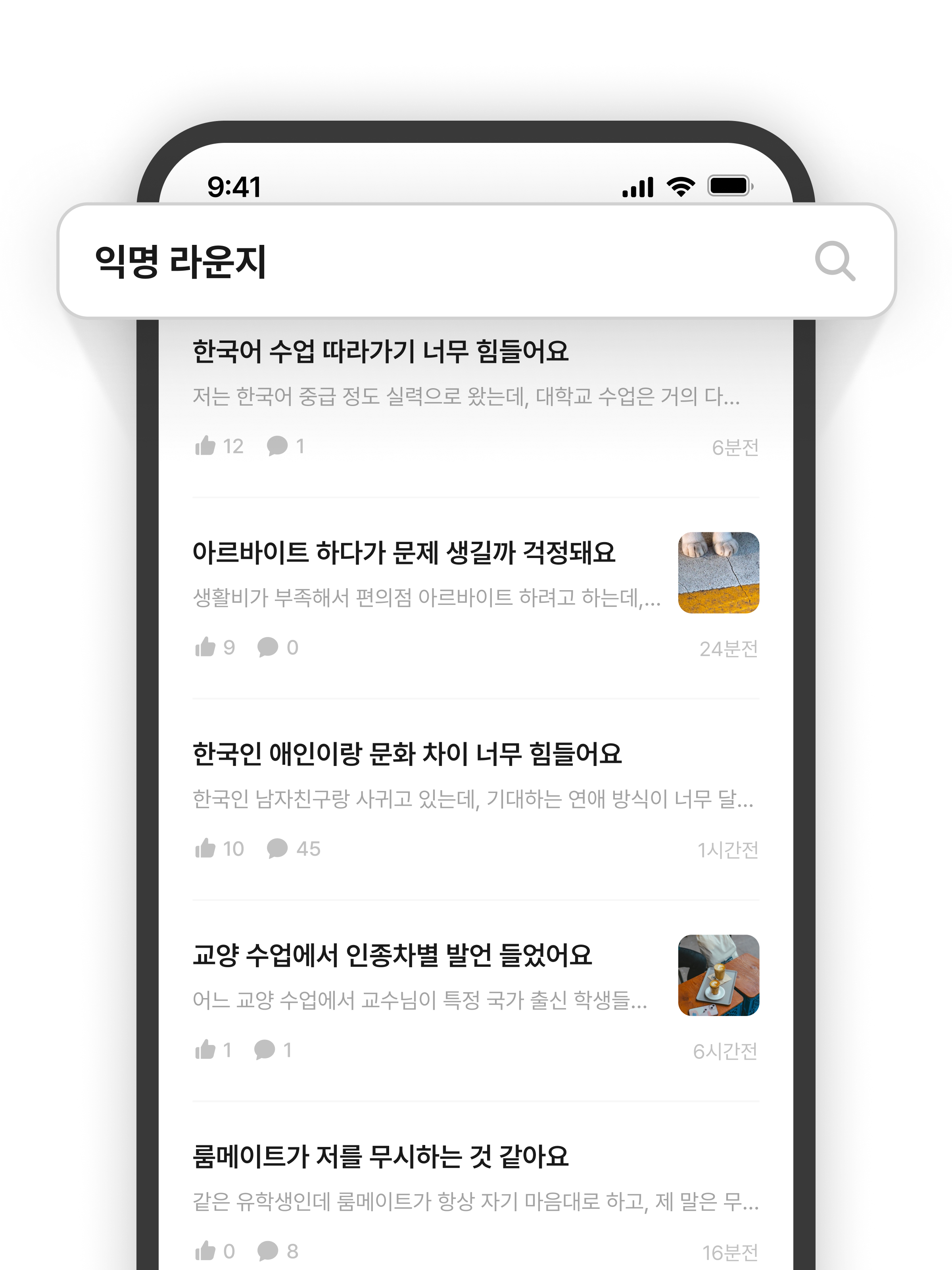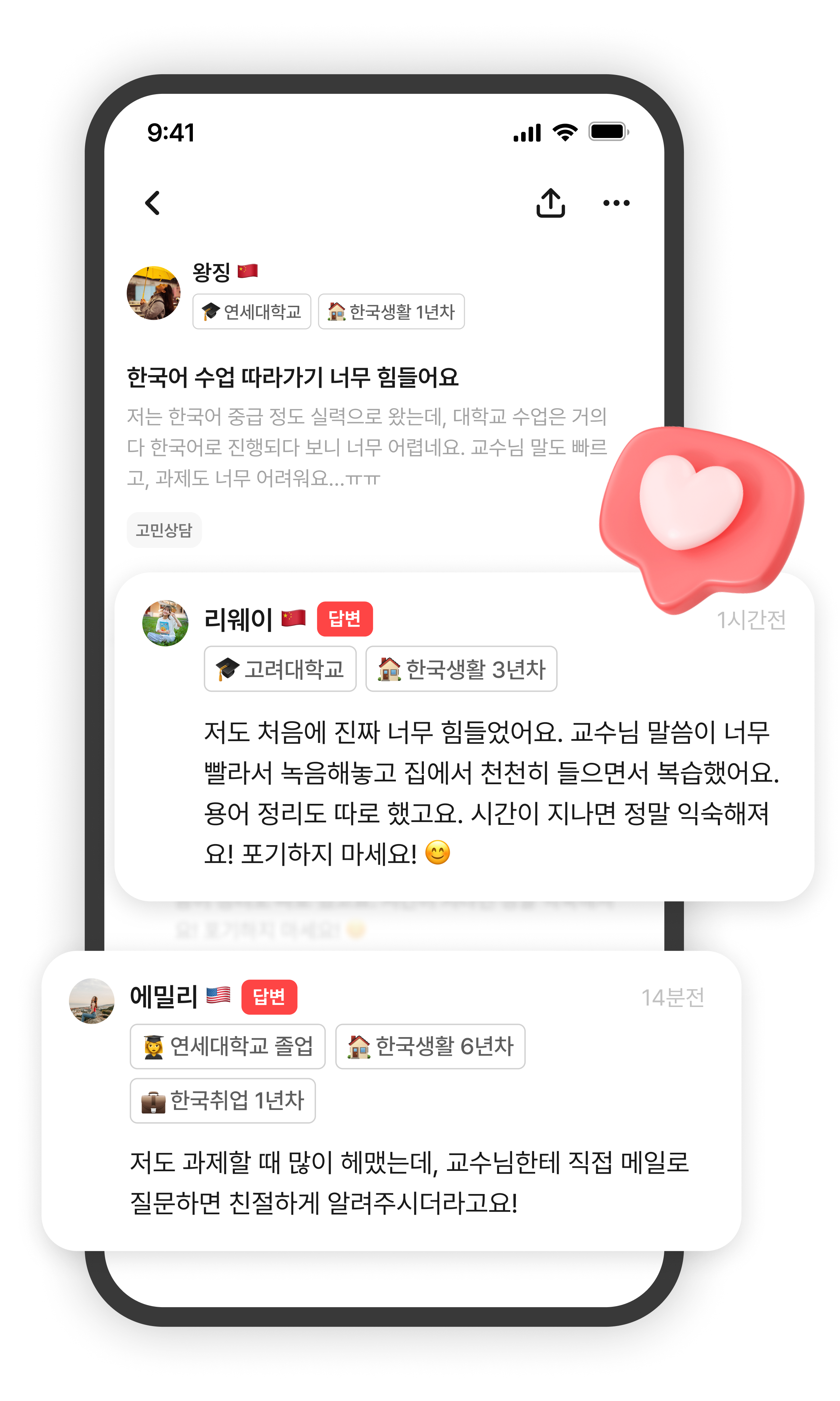 한국 생활에 대한 고민을 나누세요.