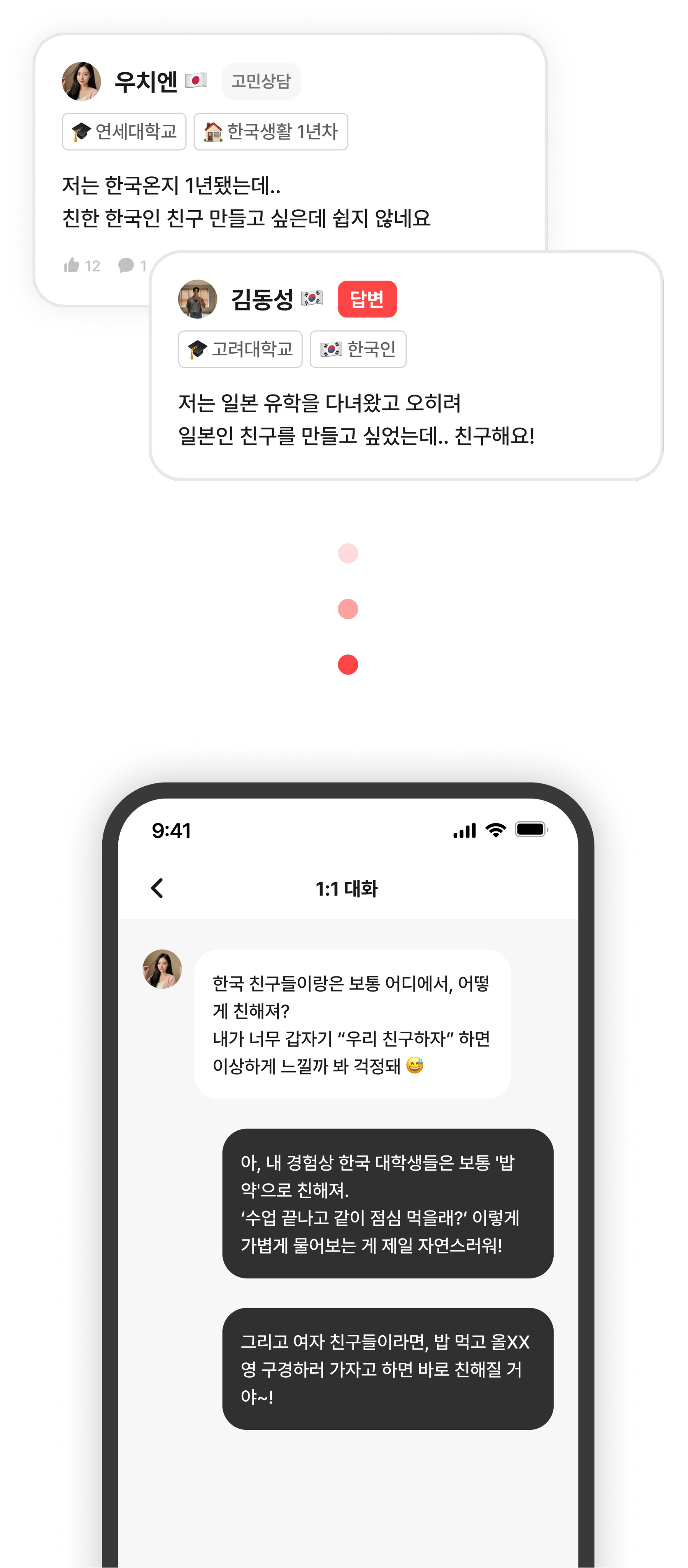 1:1 채팅으로 더 깊게 교류해요